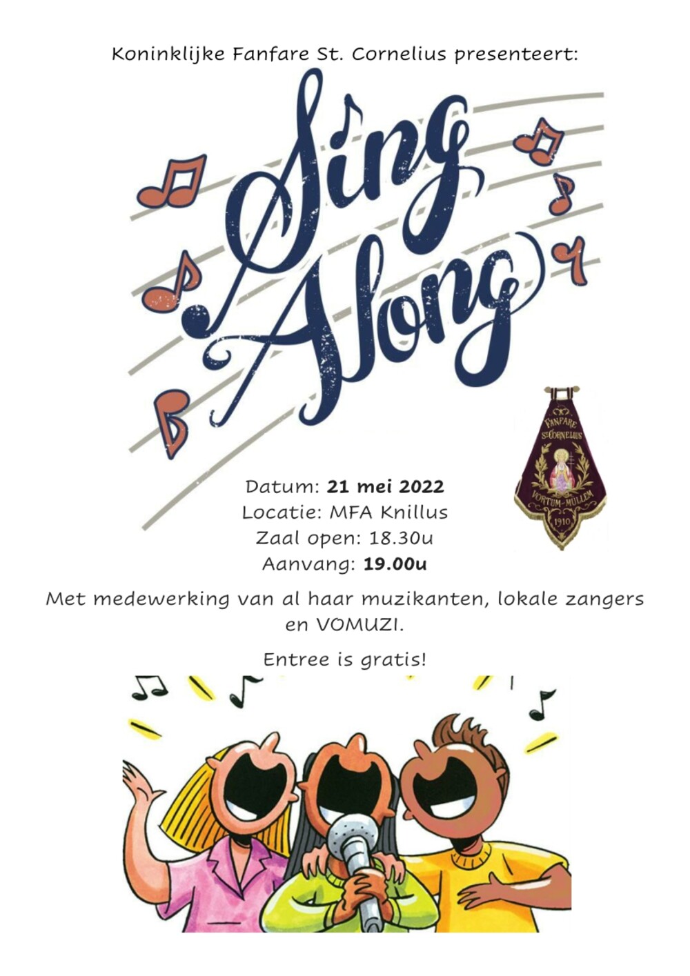 Het beloofd een avondvullend programma te worden met lokale artiesten, herkenbare Sing a Long liedjes en zelfs Oliebollen. Want die had u nog van ons tegoed. Kortom een avond met alle ingrediënten van het traditionele nieuwjaarsconcert. Zoals de blokfluiters, opleidingsorkest, slagwerkgroep, Vomuzi en het Fanfare orkest. Maar deze keer geen heaters bij de ingang, maar een korte broek en tshirt. Hopelijk zien wij u allen 21 mei vanaf 19.00 u in MFA Knillus. Entree is gratis.