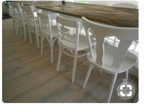 Een aantal houten stoelen waarvan de achterzijde (rugleuning) rond de 80 tot 90 cm vanaf de grond gemeten is.