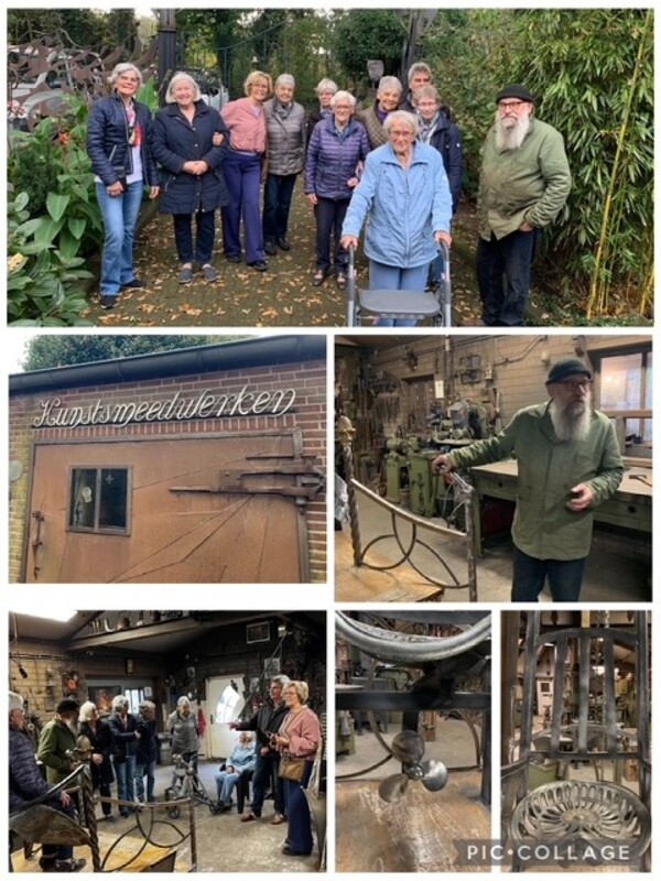 Ongelooflijk wat die man allemaal kan maken van ijzer en oude voorwerpen. Het meest nieuwsgierig waren we natuurlijk naar het kunstwerk wat hij voor ons dorp aan het maken is. Eerst kregen we een stukje geschiedenis over ons mooie dorp en daarna toonde hij het kunstwerk wat hij aan het maken is.